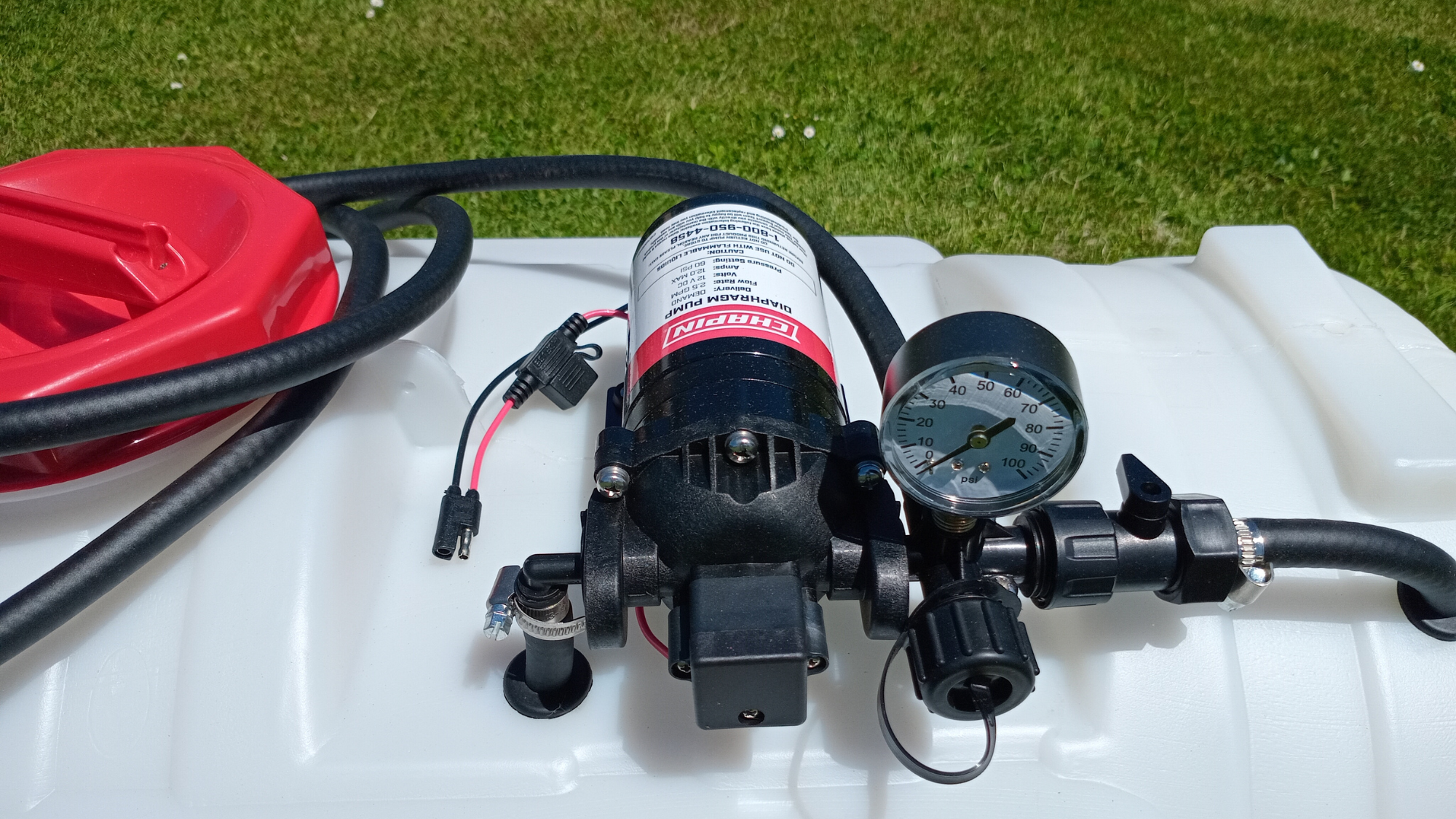 Its translucent tank lets you quickly check liquid levels, while the 8.3 LPM 12-volt diaphragm pump delivers reliable performance and a maximum pressure of 70 PSI (4.8 bar) — reaching an impressive 11.5 m vertical and 8 m horizontal spray distance.